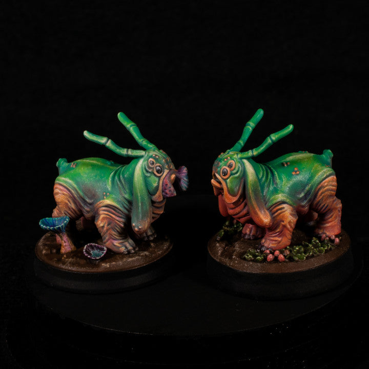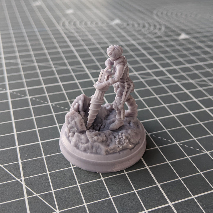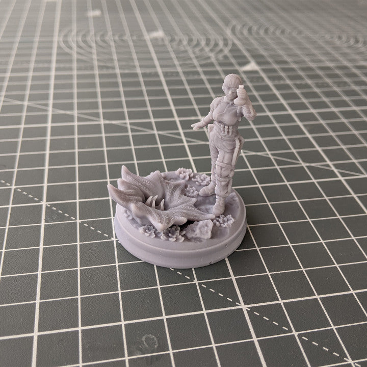 Our Space Pioneers collection of miniatures takes place on the exoplanet Aether, Planet 579a in the Milky Way Galaxy. The planet Aether has rich biodiversity, an acceptable atmosphere for humans and slightly higher gravity than Earth. It's landscapes are rocky with lush mats of vegetation and unusual flowers and mushrooms.