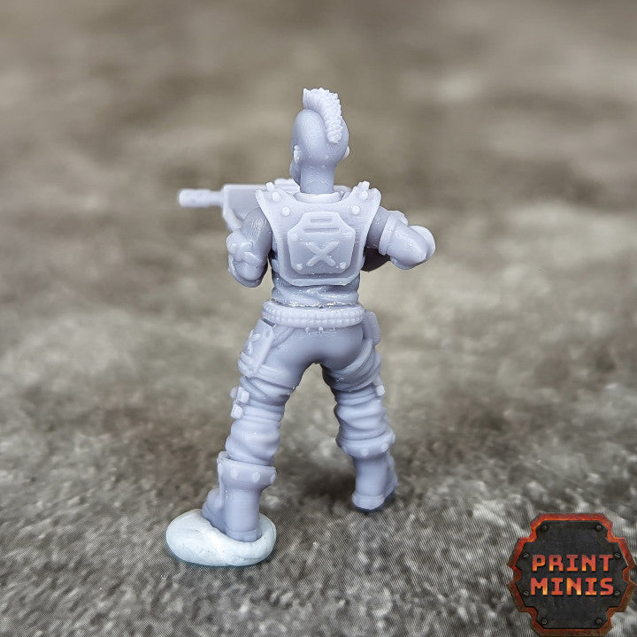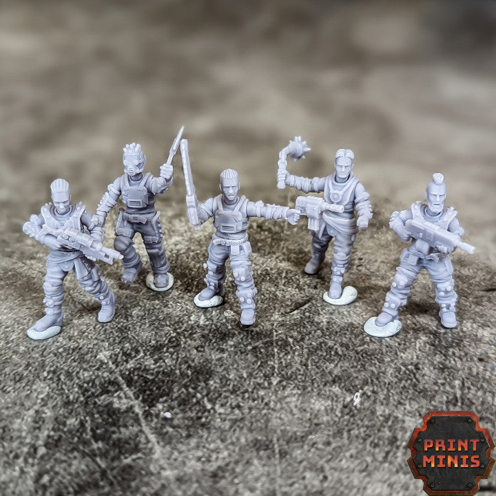 In 28mm heroic scale. This modular gang is perfect to add to your existing gang as hired mercenaries, or use as their own gang on your tabletop. They have fashioned their own armour from junk and have nothing left to loose, making them ferocious in battle! They are provided as modular torsos, legs, arms and heads to give you the greatest combination of pieces for your gang.